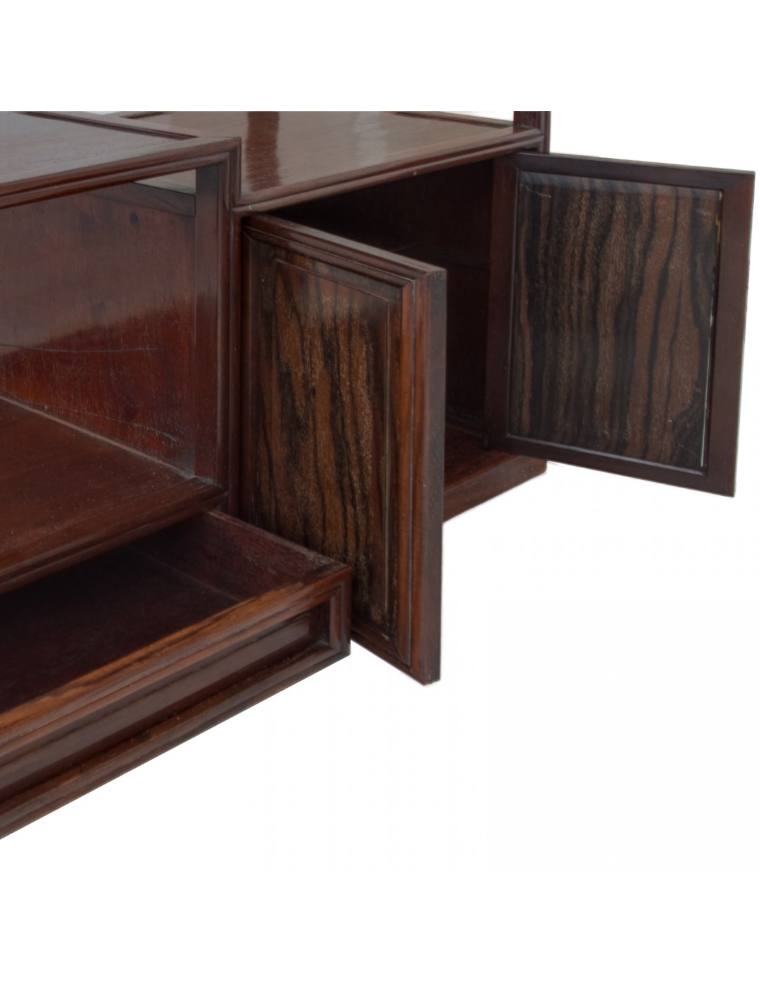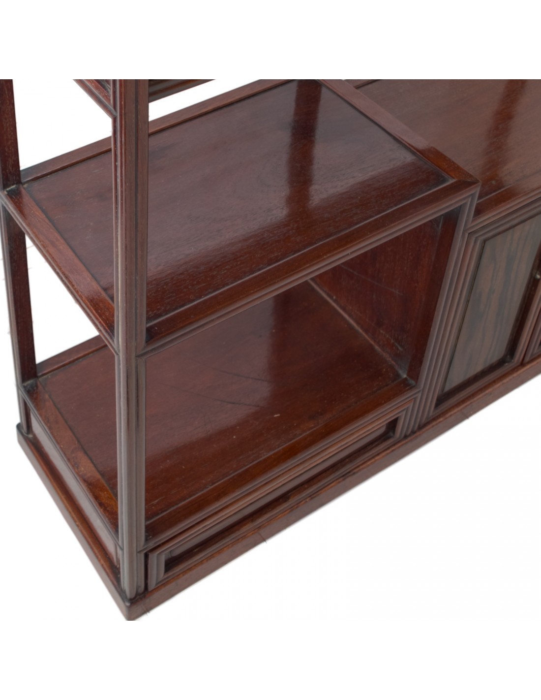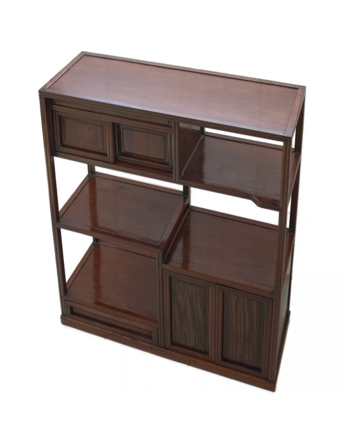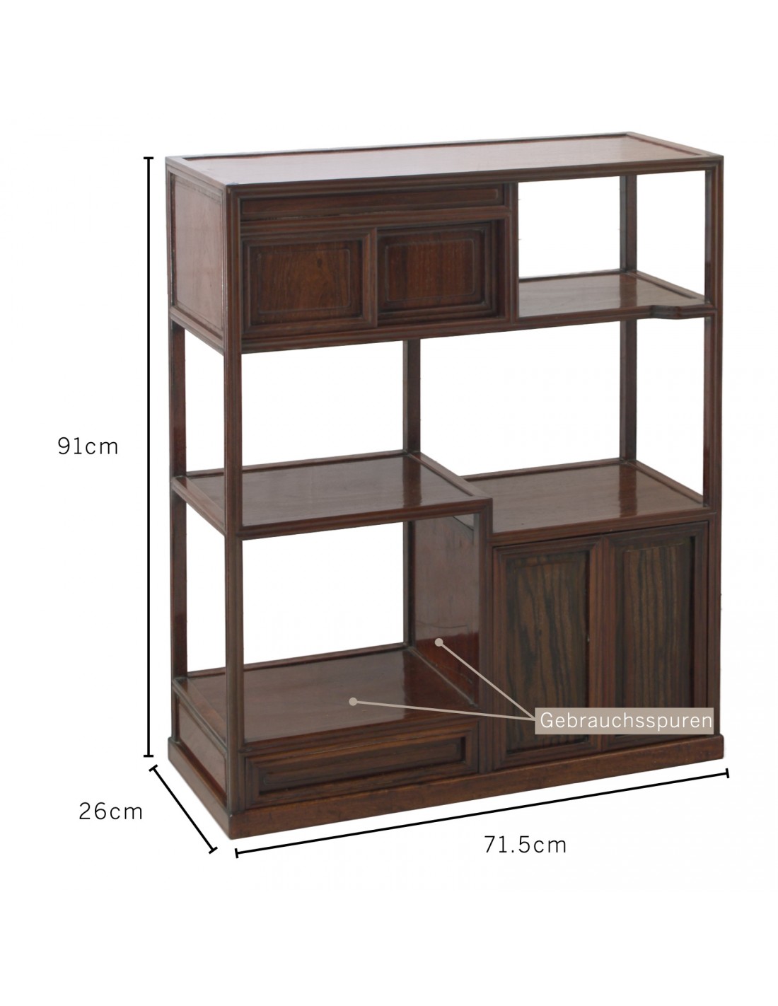 Klassisches Ausstellungsregal aus Japan. Einzelstück. Abmessungen: Höhe 91 cm, Breite 71.5 cm, Tiefe 26 cm. In gutem Zustand. Gebrauchsspuren im Ablagefach unten links. Mehrere Ablageflächen. Drei Etagen. 2 Fächer mit Türen. 1 kleine Schublade unten links. Flexibel einsetzbar. Tragbar. Traditionell zur Aufbewahrung und Präsentation von Dekorationsgegenständen, Büchern, Bonsai, Sammlerstücken oder Utensilien für die Teezeremonie.