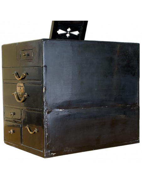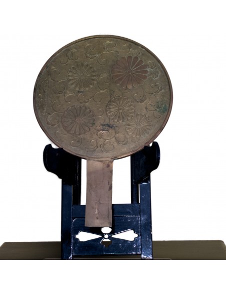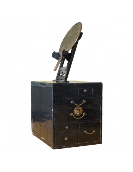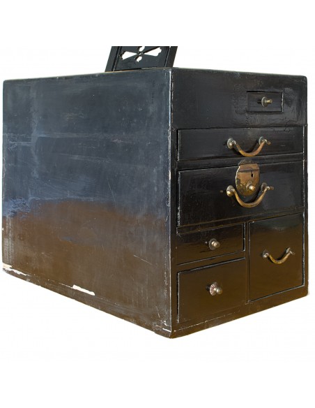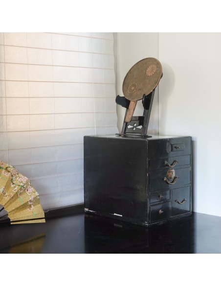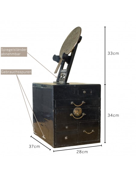 Frisierkommode Kyōdai, vermutlich Edo-Zeit. Breite 28cm, Höhe 34 cm (ohne Spiegel) bzw. 67 cm (mit Spiegel), Tiefe 37 cm. Die Kommode diente zum Frisieren und Schminken. Mehrere kleine Schubladen für Utensilien. Die Kommode ist schwarz lackiert, deutliche Gebrauchsspuren. Die Schubladen lassen sich einwandfrei öffnen und schliessen. Bronzespiegel mit Griff, auf abnehmbarem Ständer auf der Kommode. Spiegel aus dem späten 18. Jahrhundert mit Chrysanthemenmotiv auf der Rückseite, entworfen vom Spiegelmeister Fujiwara Masashige.