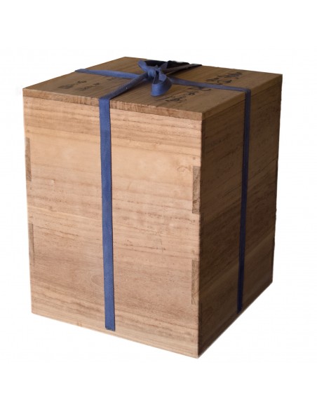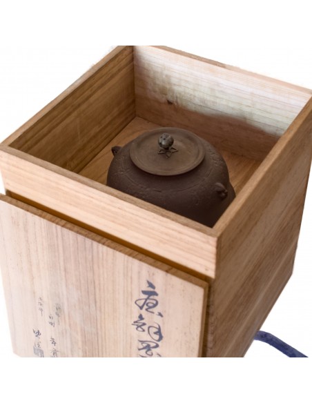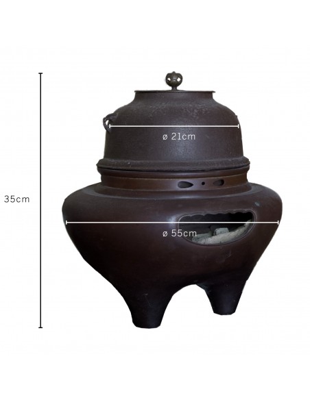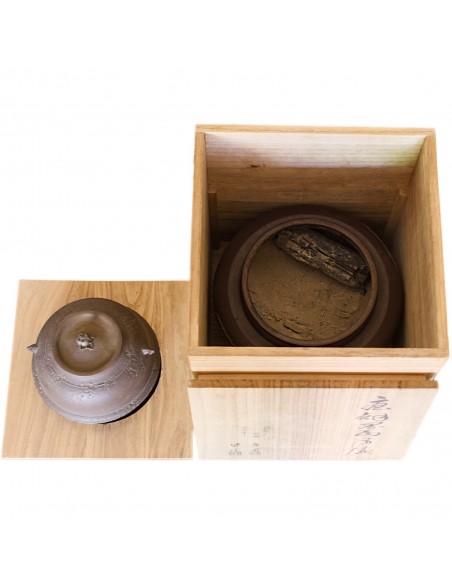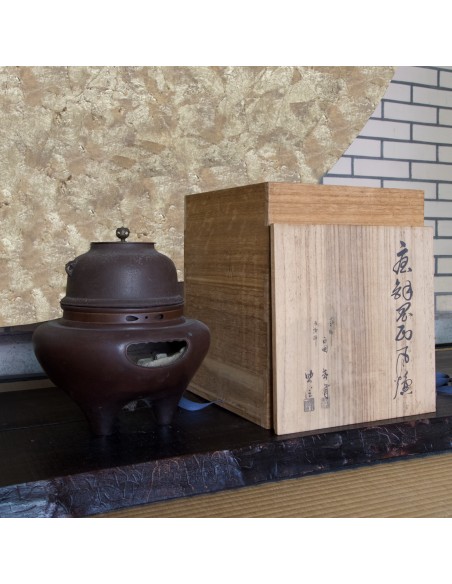 Antiker japanischer Windofen (jp. furo) mit dazugehörigem Teekessel (jp. furogama) aus Eisen und Holzkiste zur Aufbewahrung. Traditionell für die Teezeremonie verwendet. Dieses Kohlefeuerbecken hat eine bauchige Form mit drei kurzen Beinen und zwei Öffnungen. Durch die Öffnungen kann die Kohle gelegt und die Glut reguliert werden. Auf dem oberen Rand steht der Kessel (jp. furogama), in dem das Wasser während der Teezeremonie zum Kochen gebracht wird. Der Kessel ist kuppelförmig, mit zwei Ösen auf der Seite. Deckel mit rundem Knauf zum Anheben. Typisches Design der Edo-Zeit (1603–1868). Deutliche Gebrauchsspuren, aber in gutem, robustem Zustand.