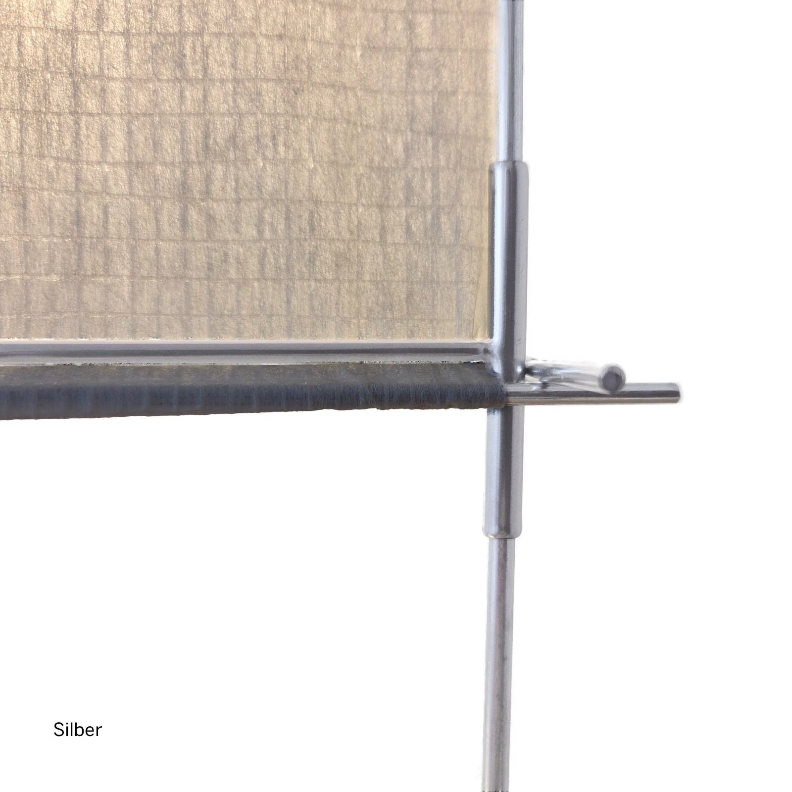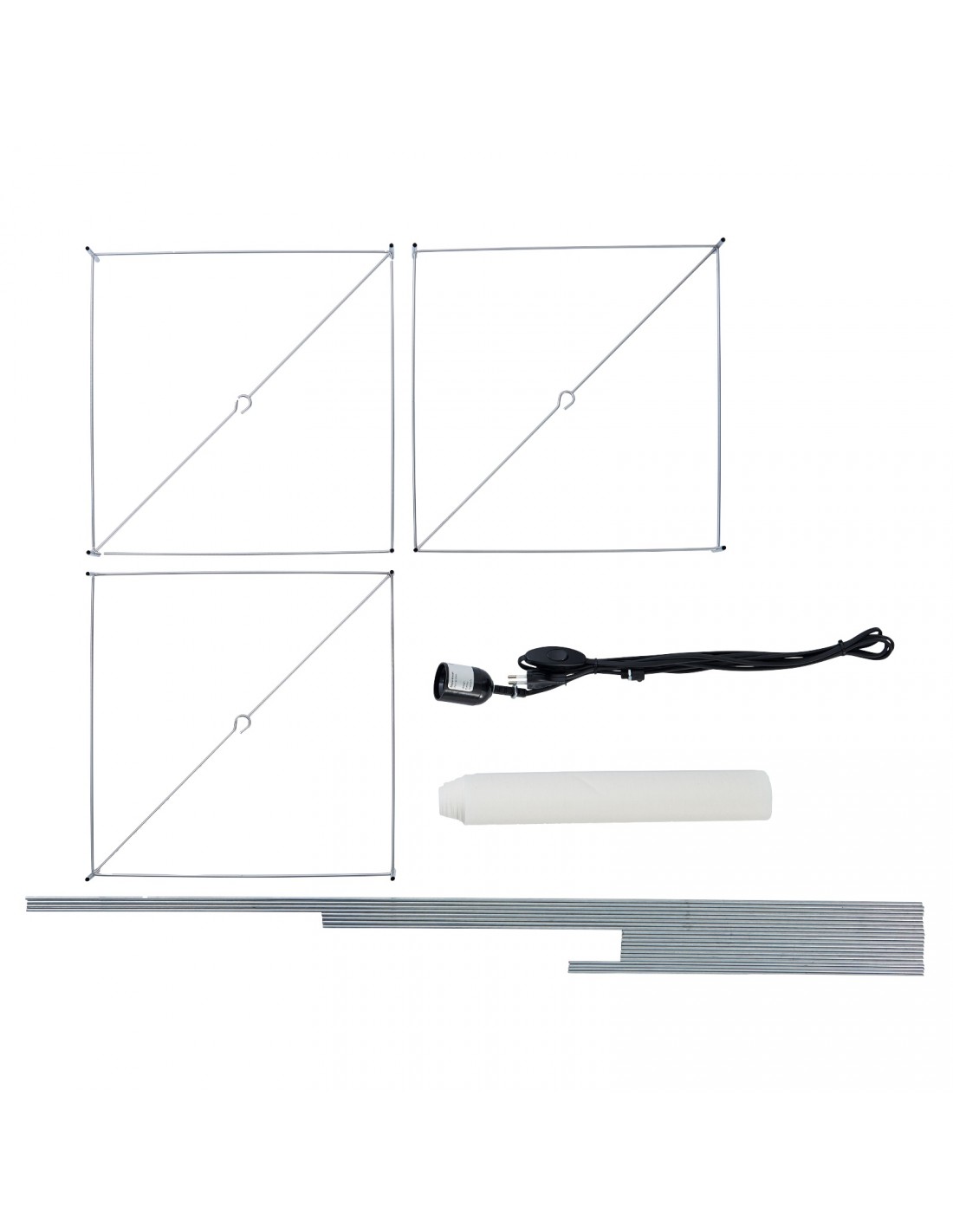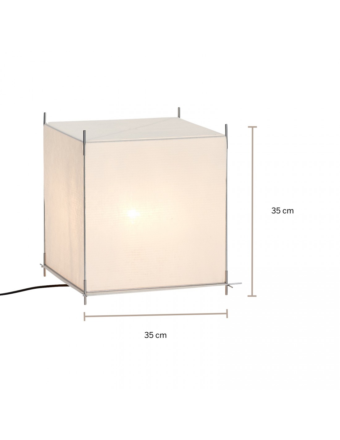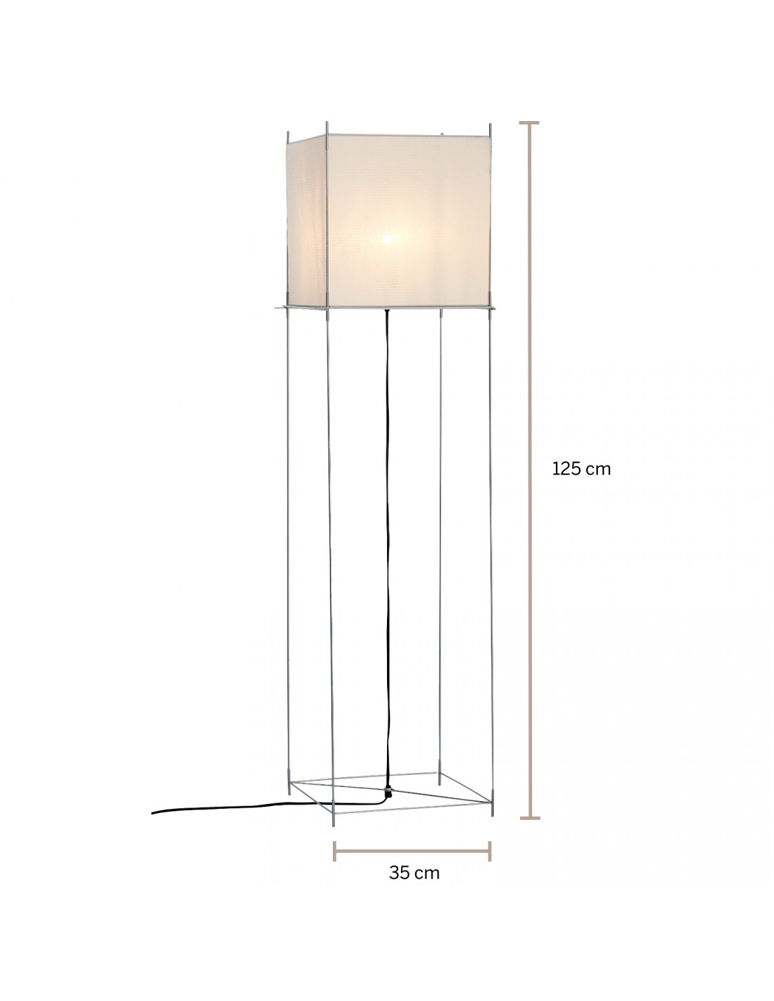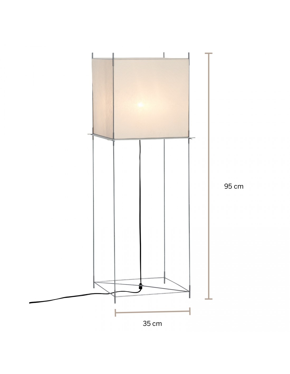 Die Leuchte basiert auf einem 35 x 35 cm grossen Kubus und kann mit zusätzlichen Metallstäben auf vier Höhen eingestellt werden: 35, 65, 95 oder 125 cm. Alle hierfür benötigten Stäbe werden mitgeliefert, sodass die Höhe jederzeit angepasst werden kann.