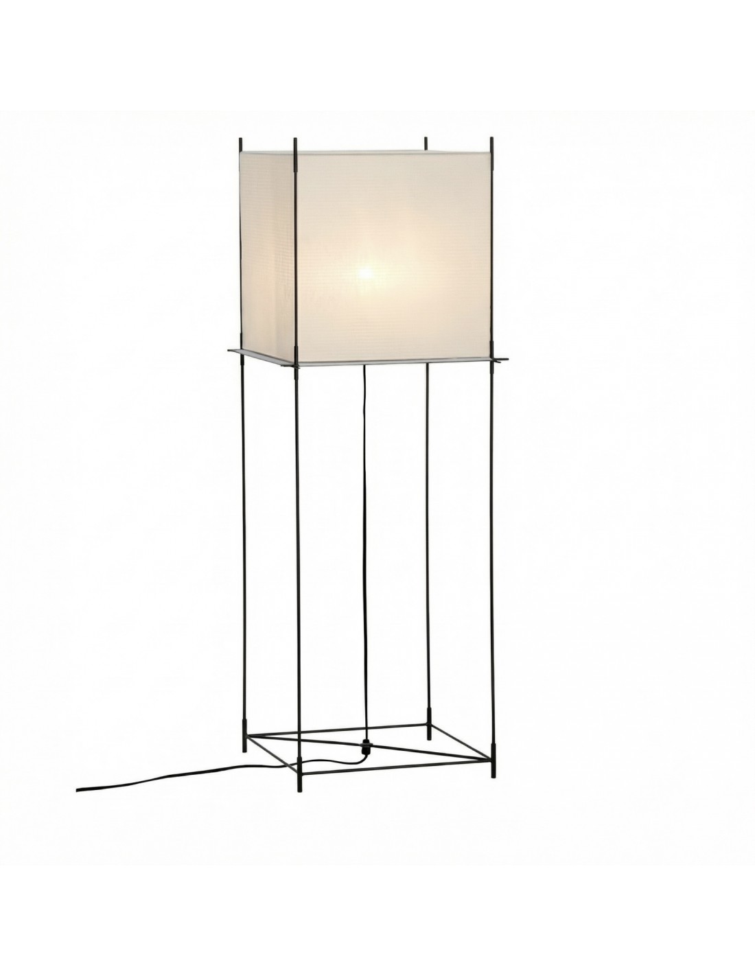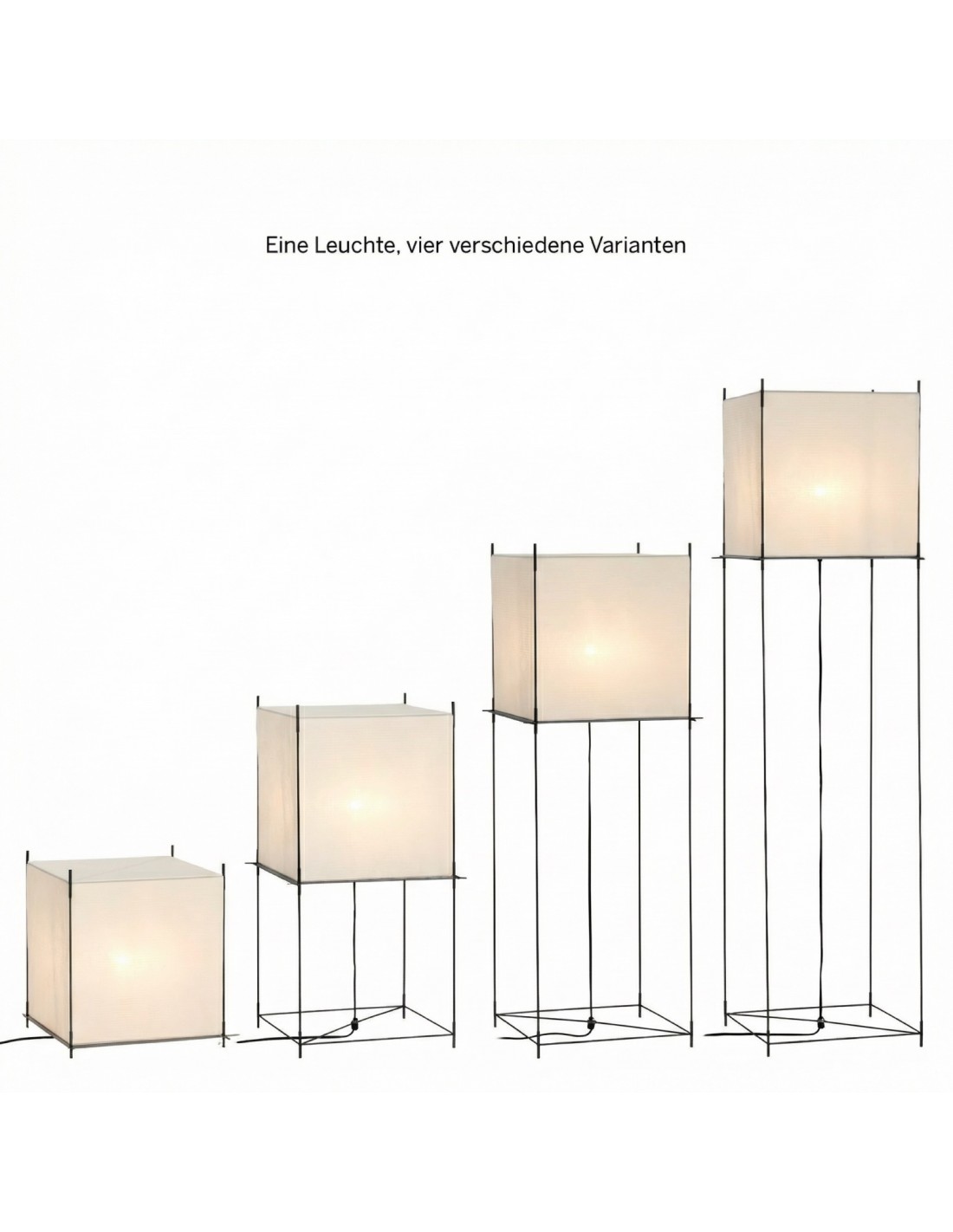 Die Leuchte basiert auf einem 35 x 35 cm grossen Kubus und kann mit zusätzlichen Metallstäben auf vier Höhen eingestellt werden: 35, 65, 95 oder 125 cm. Alle hierfür benötigten Stäbe werden mitgeliefert, sodass die Höhe jederzeit angepasst werden kann.