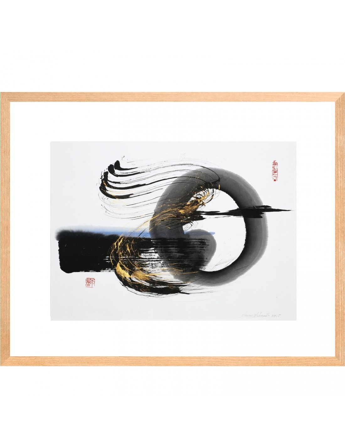 Ink, ink with gold pigment and blue pigment, handmade Japanese paper, remounted