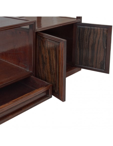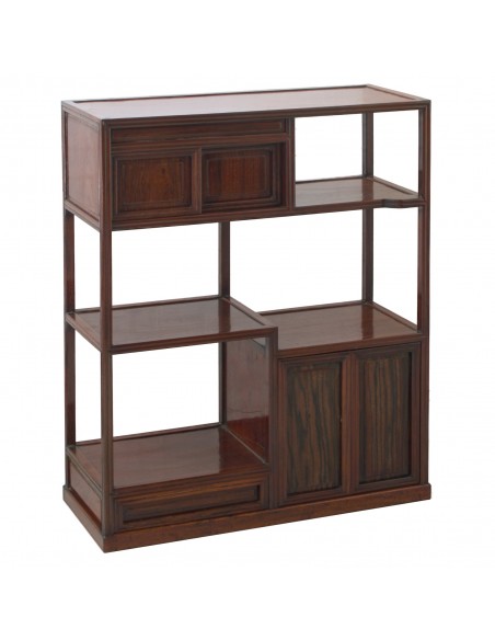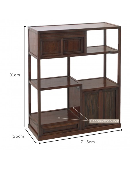 Classic display shelf from Japan. Single piece. In good condition. Signs of wear on lower left shelf, see photos. Several shelves. 3 levels. 2 compartments with doors. 1 thin drawer. Flexible use. Can be carried and moved by one person. Traditionally used to store and display decorative objects, books, bonsai, art objects or tea ceremony utensils. Dimensions: Width 71.5, height 91cm, depth 26 cm.