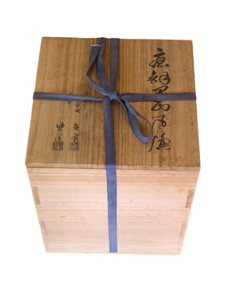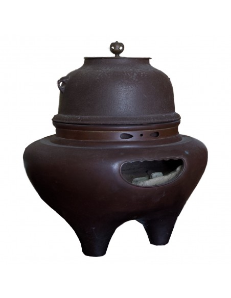 Antique Japanese brazier (jp. furo) with matching iron tea kettle (jp. furogama) and wooden box for storage. Traditionally used for the tea ceremony. The coal fire basin has a bulbous shape with three short legs and two openings. Through the openings, the coal can be placed and the embers regulated. On the upper edge is the coal fire kettle (jp. kama), in which the water is brought to the boil during the tea ceremony. The kettle is dome-shaped, with two eyelets on the side. Lid with a round knob for lifting. Typical design of the Edo period (1603-1868). Clear signs of use, but in good, robust condition.