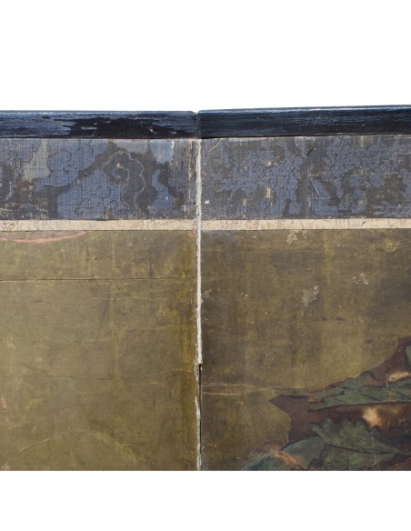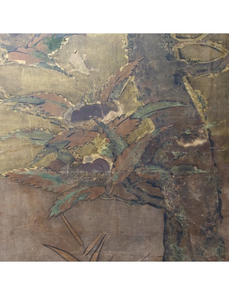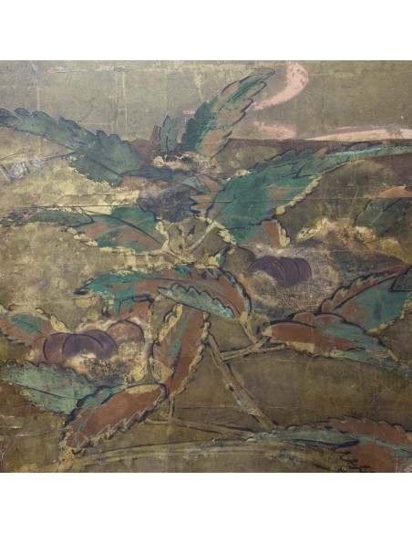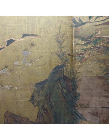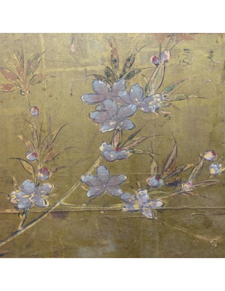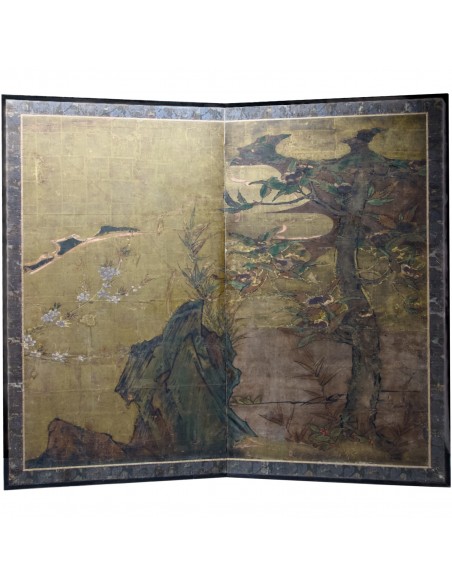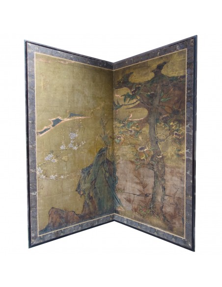 Antique 2-part Japanese folding screen. Width: 2 x 88 cm, height: 160 cm. Aesthetic room divider or decorative art object. The picture shows a nature scene at the beginning of the transition from winter to spring. In the foreground a branch with delicate plum blossoms, a tree with leaves, plants and rocks below, clouds in the background. The state of preservation and the gold leaf background indicate an older painting, circa 17th or 18th century. Stylistically attributable to the Kano school.