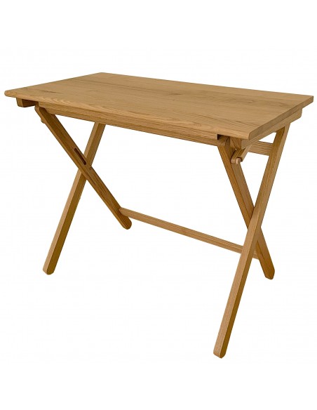 High-quality folding table made of solid wood. Desk, reading table, small dining table or dressing table. The tabletop, with a slightly rounded edge on the seating side, is made of Japanese chestnut, the legs of Japanese oak. The surface is treated with vegetable oil for a pleasant feel. The folding mechanism is also made of wood, with magnets to help lock it in place. Dimensions: Width 90 cm, depth 46 cm, height 70 cm, weight 9 kg, maximum load 50 kg. Easy to fold and store. The solid wood gives each folding table a unique grain and colouring.